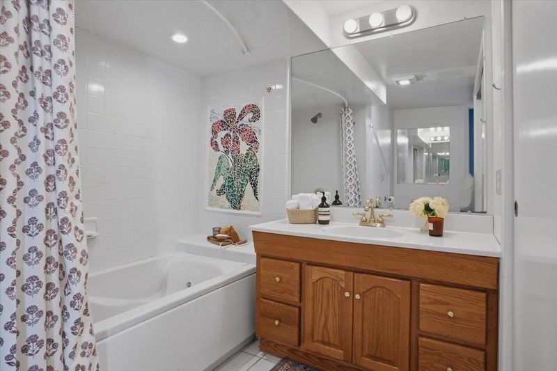 Double Sinks, Full on Ground Floor, Primary - Stall Shower(s), Showers over Tubs - 2+, Skylight, Stone, Tile, Updated Bath