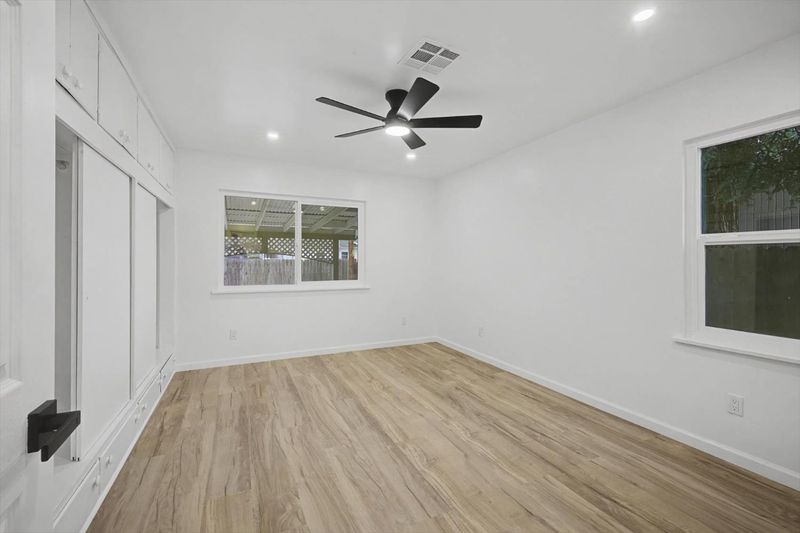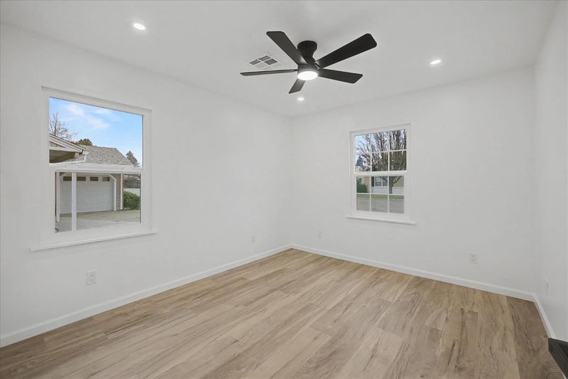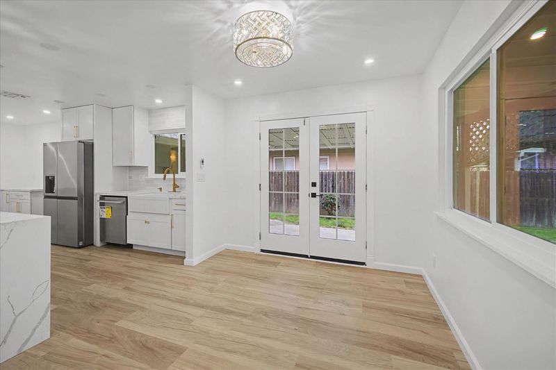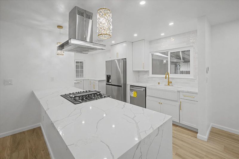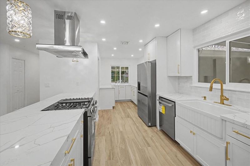 Beautifully remodeled sleek and stylish home that's designed for comfortable living on a spacious lot. Freshly painted inside and out, this move-in-ready home features a brand new roof, LVP flooring throughout, fully remodeled bathrooms with stylish hardware and luxurious flooring, plus a restored original hardwood floor in one bedroom to capture the vintage charm. The kitchen is equipped with brand-new stainless appliances, quartz waterfall counters, sleek new cabinets, and generous storage, making everyday meals and gatherings easy and enjoyable. Dual-pane windows provide energy efficiency and year-round comfort, while the fireplace creates a cozy space for cool evenings. Step outside to a large covered patio-perfect for weekend barbecues and outdoor play with fresh new grass in the front. May also have space in the backyard for an ADU. (Buyer to confirm). Includes a garage plus 2 separate driveways, including RV parking. This home offers the ideal setting for creating lasting memories. Conveniently located near schools, shopping and public transportation.