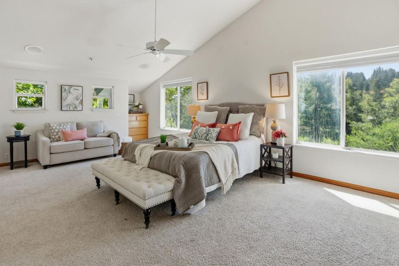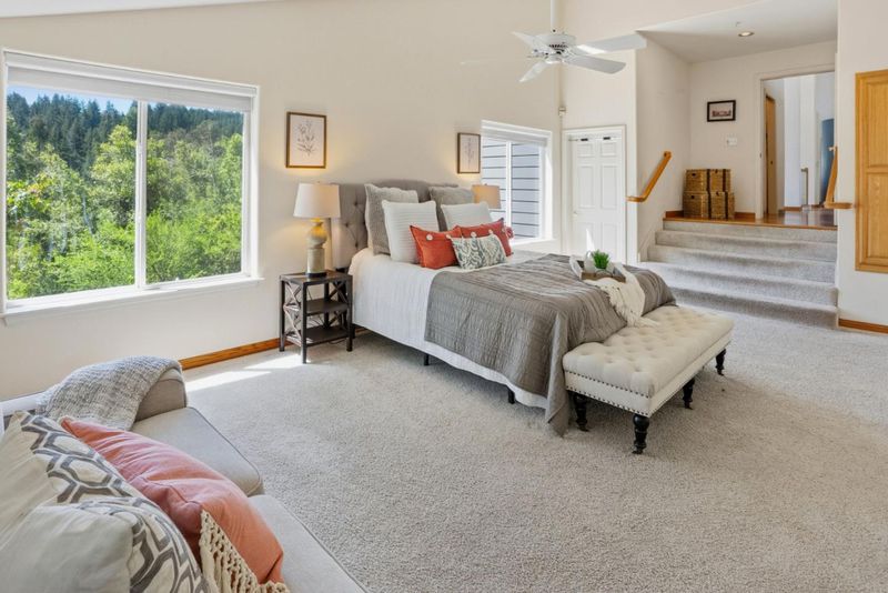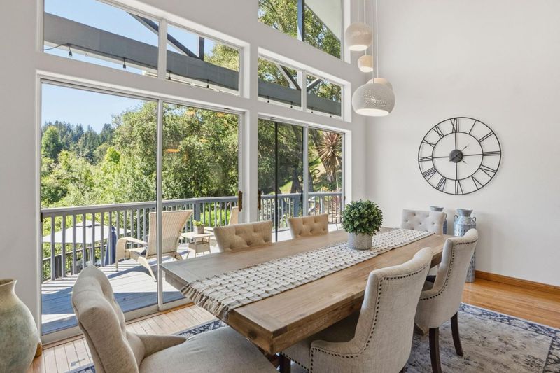 Contemporary mountain home with dramatic high ceilings, walls of windows, serene mountain & meadow views! Sunny usable acreage with colorful drought-resistant landscaping, grassy meadows, and magical redwood fairy rings! An abundance of space to add an ADU, horses, sport court, vineyard, or orchards. The 2-story home is an inverted floorplan with formal entry on the 2nd floor, featuring soaring ceilings and huge artsy chandeliers. Kitchen with granite tile counters, breakfast dining area, walk-in pantry. Formal living room with gas log fireplace, sliders to the front deck with meadow views. Separate family room with woodburning stove. Formal dining room. Kitchen and dining rooms both open to the sunny back deck with automatic awning, and hot tub. Steps down to an Endless Pools swim spa & sauna. The huge primary suite retreat features two 2-story high walk-in closets, spacious ensuite bathroom with oversized jetted tub, stall shower, and dual vanity, marble tile throughout. The lower level comprises two further beds & full bath, utility room, laundry/mud room, and access to the 2 car attached garage. Quality built in 1996 (post-earthquake) to more stringent engineering codes. New (owned) solar, powerwalls, & auto generator. Pool/garden shed, art studio/she-shed, and chicken coop.