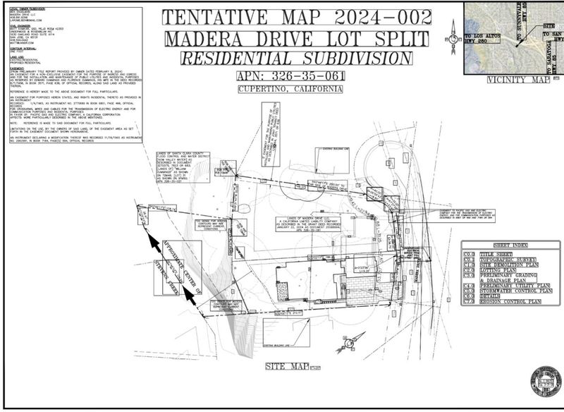 An exceptional development opportunity in a prime Cupertino location for DEVELOPERS & BUILDERS. This expansive 0.77 acre creekside parcel comes with an approved tentative map for a 2-lot subdivision. The property currently includes a single story SFR in original condition. LOT 1 offers a 15,042 SqFt gross lot with 10,427 SqFt of net usable area, extending into a scenic hillside with access down to Stevens Creek. Planning approval is in place for a 2-story, 4,383 SqFt home with 5 beds/4.5 baths, 3-car garage, & a JADU. LOT 2 features a flat 14,135 SqFt lot, ideal for a large custom home & also SB-9 eligible. Conveniently located near Stevens Creek Blvd, Foothill Expwy, & Highways 85/280, the property provides connectivity while remaining tucked into a desirable quiet residential setting within the sought-after Cupertino School District (Monta Vista & Kennedy). The site provides close proximity to Apple Park & Silicon Valley tech companies, making it ideal for both end-users & developers targeting executive-level housing. All design, engineering, surveys, studies, reports and approval documents are available upon request. Buyers to conduct their own due diligence, verification, and confirmation of development potential with the City of Cupertino.