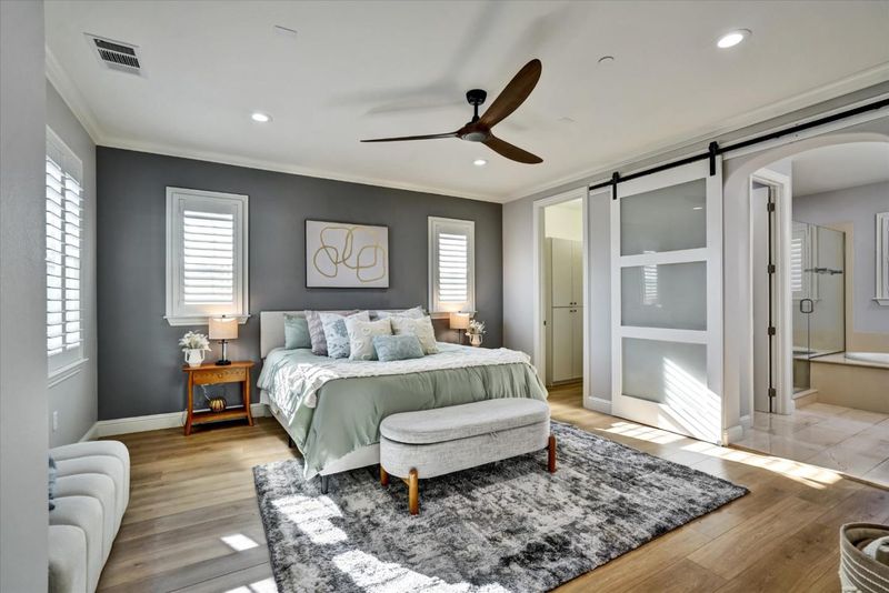 NORTH FACING! Stunning Toll Brothers home is located in the highly sought-after Cordova community at Gale Ranch. Featuring the desirable Rosata floor plan offers 4 bedrooms and 3 full bathrooms, including one bedroom and a full bath conveniently located on the main level. Open-concept layout features spacious living and dining areas. The chef's kitchen boasts a center island with granite countertops, custom backsplash, and elegant walnut cabinetry. Additional highlights include upgraded custom built-in cabinetry in all bedroom closets for enhanced storage. Home theater pre-wiring in both the living and family rooms, premium shutters on all windows. An open and airy loft upstairs provides flexible space for a home office, media room, or lounge. The primary suite features a spa-like ensuite bath, creating a private retreat. A well-sized backyard with stamped concrete flooring, perfect for entertaining or relaxing. Energy-efficient Tesla solar panels with a power bank add exceptional value. Ideally located near San Ramon Community Park, this home is zoned for top-rated San Ramon schools. San Ramon is one of the Bay Areas most desirable cities for raising a family. EZ access to Dublin, shopping, restaurants, Highway 680. Don't miss this incredible opportunity to own your dream home!