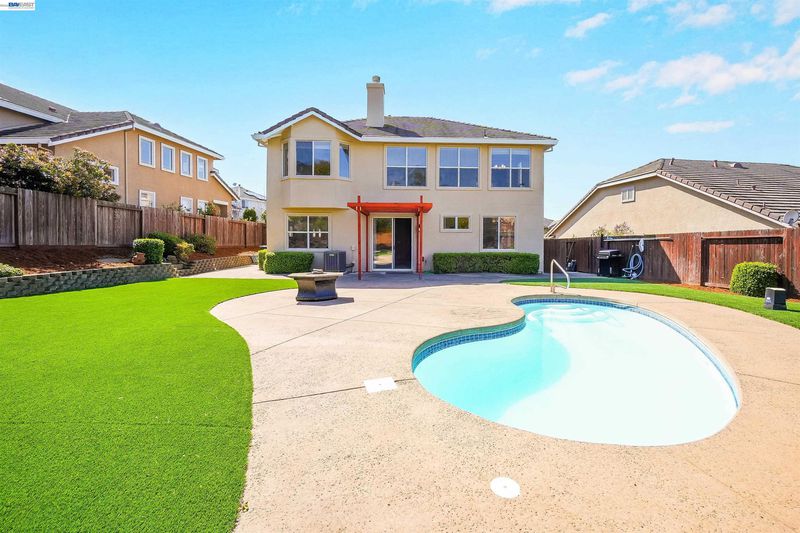 Located in the highly desirable 5 Canyons Neighborhood, this "original owner" home sits on a larger 11,315 sq ft lot and boasts an incredible low-maintenance backyard featuring extensive hardscaping, abundant Synthetic Turf Grass, and a fiber glass in ground swimming pool that will make your home the envy of friends and family. Unglazed flat-plate type solar pool heating panels keep the pool comfortable all summer! Inside, the kitchen offers ample oak cabinetry, crown molding, and high-end appliances. Desirable split level plan has a natural flow to the upstairs or downstairs. Upstairs you'll enjoy the living and dining room areas, the home office, a 1/2 bath, and the primary suite with ensuite bathroom. Downstairs you have a family room with access to the backyard, another primary suite with ensuite bathroom, 2 more bedrooms and another full bath. New HVAC system throughout the home. Clear termite report and all roof repairs have been recently completed. Location offers access to multiple parks, Highways, BART, nearby medical services, and convenient shopping. Only one question here... which family will be enjoying this summer's barbecues while living in this home?