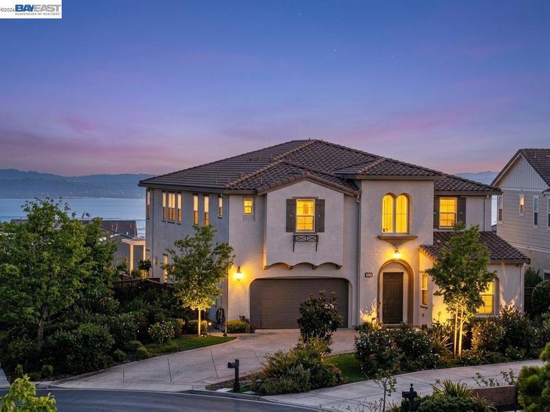 Exquisite home in prestigious Stonebrae Golf Club community, one of the most idyllic East Bay locations with spectacular views from San Francisco to South Bay. This luxury residence offers 5 bedrooms plus office, bonus room and 4.5 bathrooms, including a primary suite downstairs. The home boasts coffered ceilings, crown molding, and wainscoting. The formal dining room provides the ideal space for memorable dinners, while the open-concept kitchen and family room are ideal for gatherings. The gourmet kitchen is equipped with high-end appliances, a walk-in pantry, and a center island. A fully collapsible sliding door connects the kitchen to the outdoor California room with fireplace and STUNNING BAY VIEWS. Upstairs, the expansive master suite offers a private balcony that provides breathtaking vistas and features an expansive walk-in closet, dual vanities, oversized tub, and a sit-down vanity area. Additional features include hardwood floors, upgraded sound system in the great room, and laundry room with cabinets and a sink. The private backyard offers a covered patio with built-in BBQ, stamped concrete walkway, a putting green & a bocce court. The guarded community has 24-hour security and optional country club memberships with access to a gym, golf, tennis courts and pool.