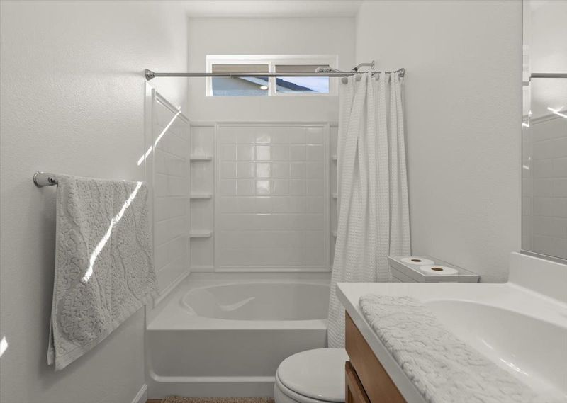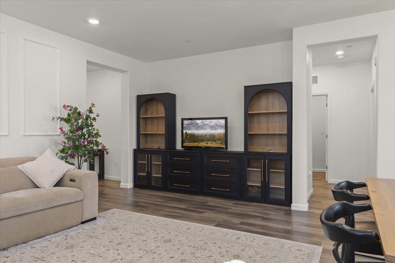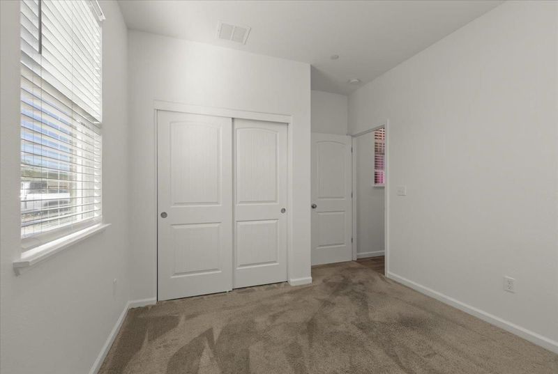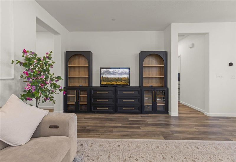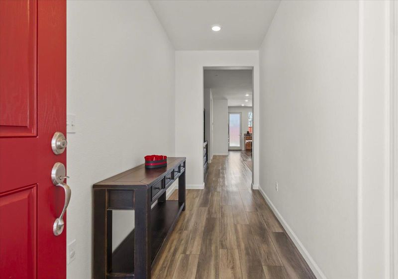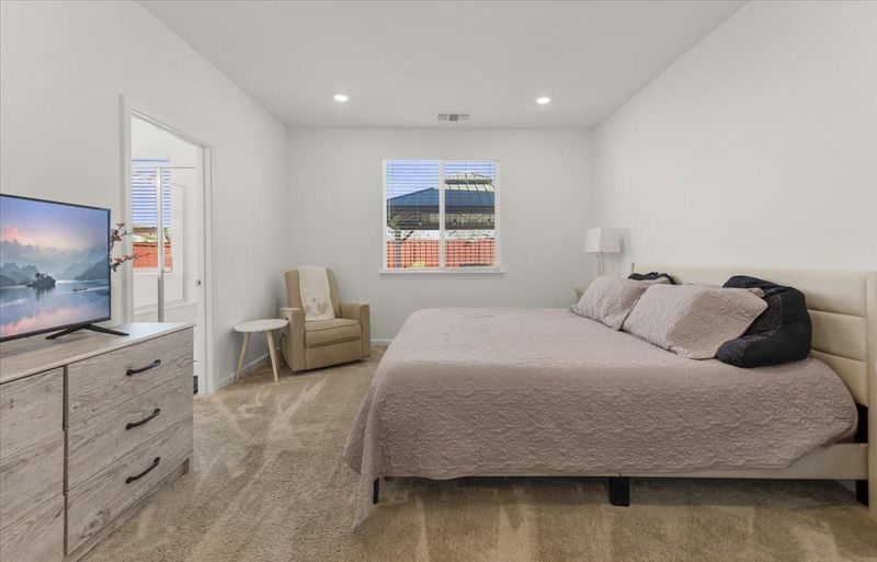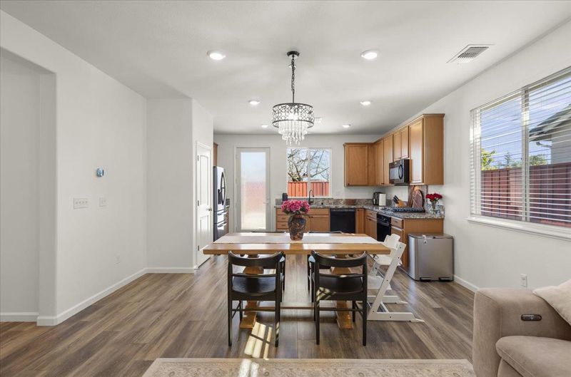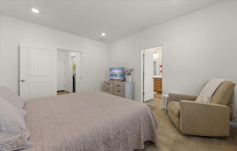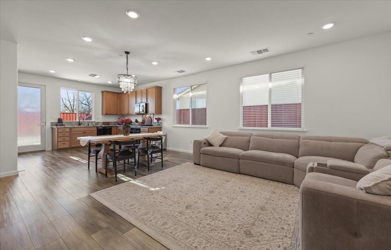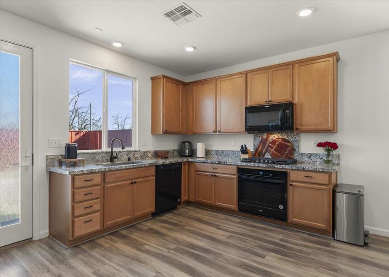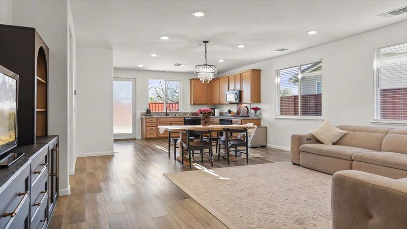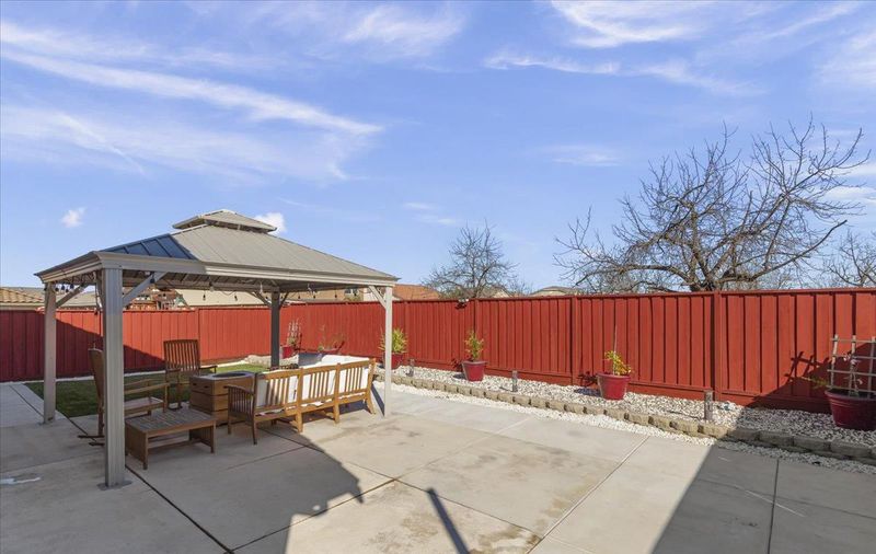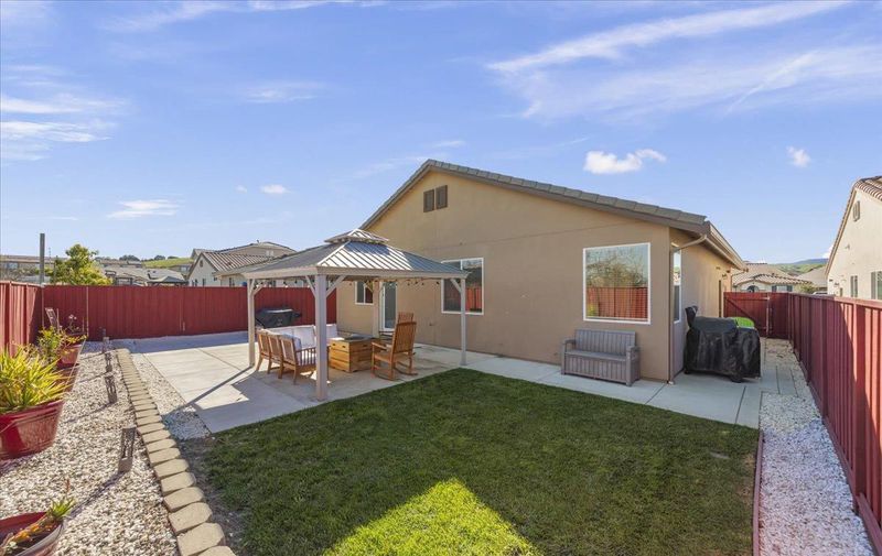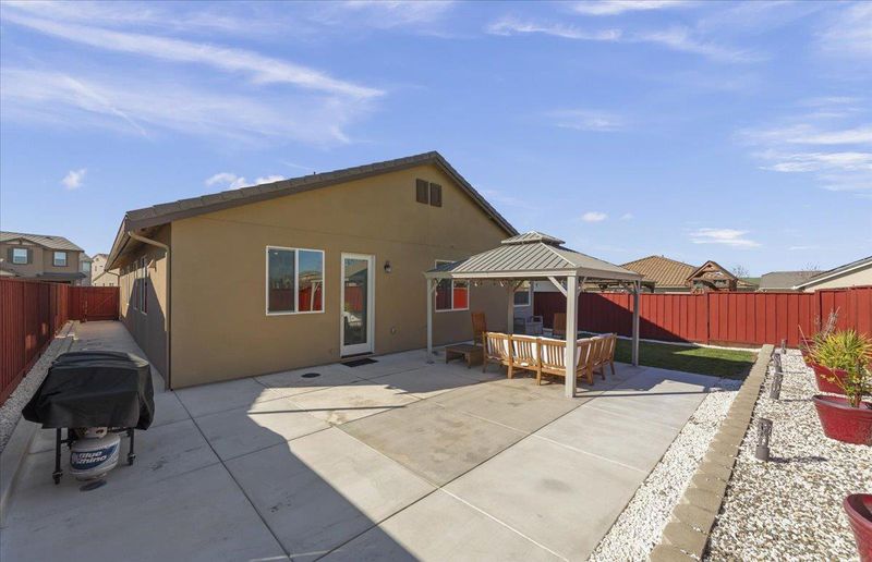 This beautiful single-story home is nestled in a peaceful, quiet, and close-knit community with no rear neighbors, offering added privacy. The kitchen features granite countertops, a full backsplash behind the stove, abundant cabinetry, and a convenient pantry for additional storage. Included with the home are the washer, dryer, refrigerator, and a smart thermostat for added comfort and convenience. Interior features include vinyl plank tile flooring, carpeted areas, dual-pane windows, and recessed lighting throughout the home. The spacious primary bedroom offers a large walk-in closet and ample room to comfortably accommodate a king-size bed and furnishings. The primary bathroom features dual sinks, a separate shower, and a deep soaking tub, creating a relaxing private retreat. The finished two-car garage is painted and epoxy-coated, and includes a tankless water heater and a built-in Tesla wall charger. The low-maintenance backyard is fully concreted and designed for outdoor enjoyment.