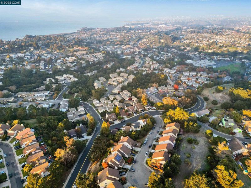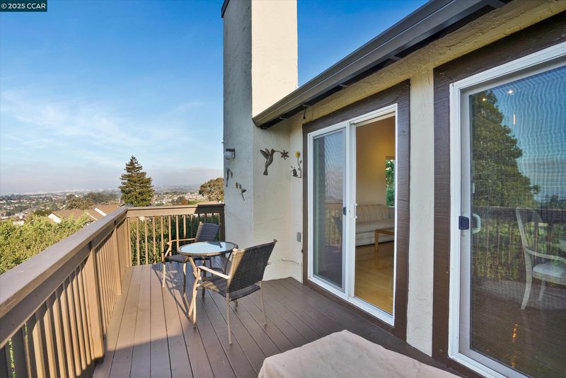 Stunning tri-level home with panoramic Bay and mountain views. Filled with natural light, the main level features vaulted ceilings, a formal dining room, and an updated kitchen with a sunny nook, new stainless steel appliances, pantry, and roll-up shades to maximize the views. Bamboo flooring accents the upper level, where a balcony offers spectacular vistas. The spacious primary suite includes a sitting area ideal for an office or workout space, plus a walk-in closet and an updated bath. All bathrooms are tastefully refreshed. A large top-floor bonus room with a wood-burning fireplace provides great flex space and includes a generous finished storage room. Additional highlights include new carpet in the downstairs bedrooms and bonus room, a gas fireplace in the living room, a storage closet ideal for a wine cellar, a two-car garage, low-maintenance landscaping, a new roof and gutters, fresh interior paint, and earthquake retrofitting. Located on a quiet cul-de-sac with easy access to I-80, shopping, dining, schools, and Kaiser.