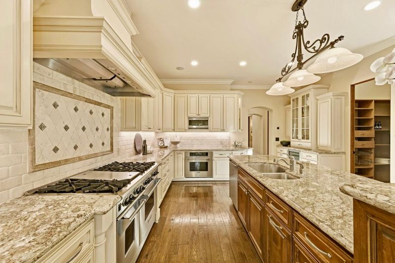 - Cooktop - Gas, Countertop - Granite, Dishwasher, Exhaust Fan, Garbage Disposal, Hood Over Range, Island with Sink, Microwave, Oven - Double, Oven Range - Built-In, Gas, Pantry, Refrigerator, Wine Refrigerator