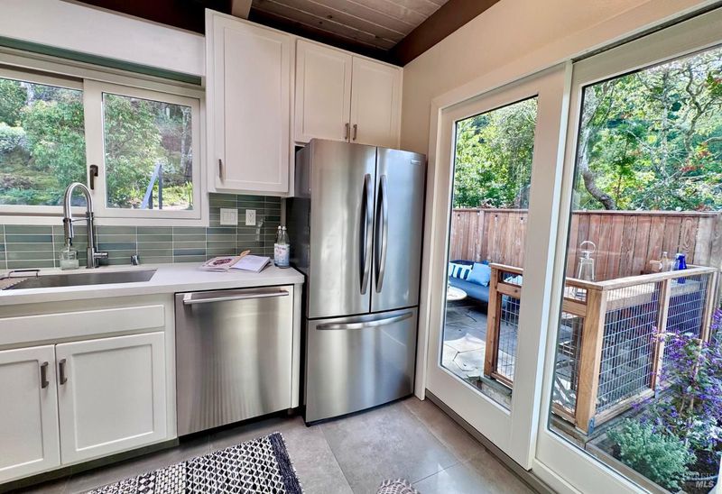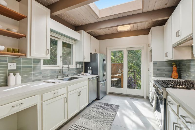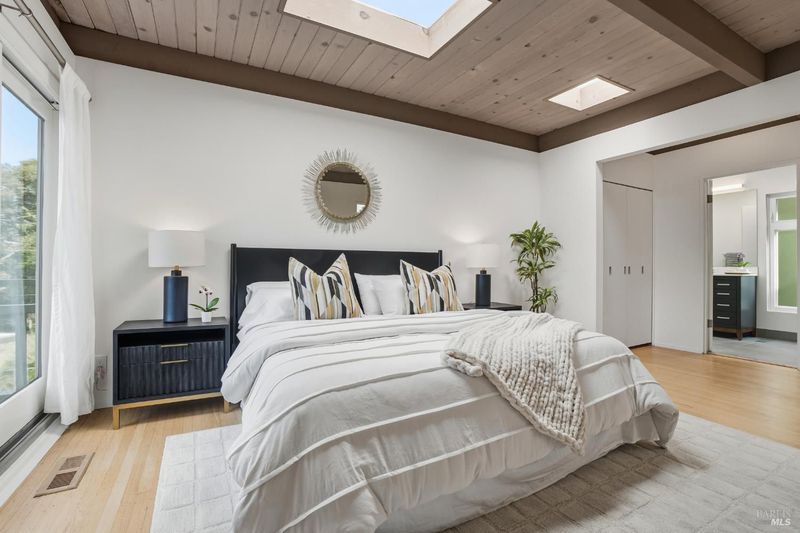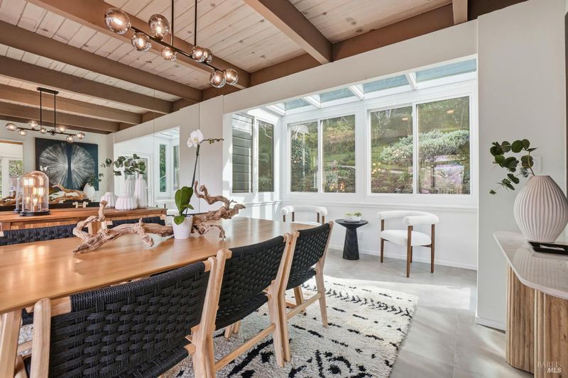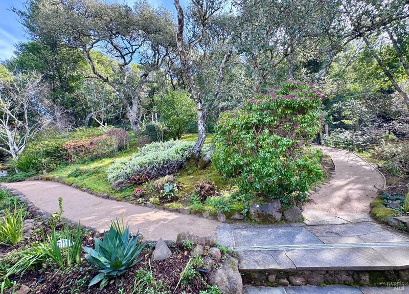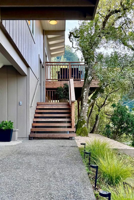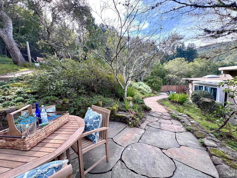 Chic midcentury modern home in highly desirable Homestead Valley with stunning Mount Tam views. Set on a large lot adjacent to open space, this 4 bed, 3 bath home offers privacy, light and spacious rooms. Soaring ceilings and floor-to-ceiling windows fill the living room with sun and showcase expansive views. The main level features living, dining, updated stainless kitchen, 3 bedrooms and 2 baths, including the primary suite with an updated ensuite and private deck. There is a walk-out patio and bar off the dining room. The large redwood deck off the living room provides views and simple indoor-outdoor living. The lower level offers a comfortable family room, a bedroom, bath, and laundry. Outside access from the lower level offers flexible living. Discover a magical woodland garden with meandering paths, mature trees and plants, flagstone patios and direct access to Homestead Valley Land Trust trails. No neighbors behind you and the lush natural setting make you feel like you are living on vacation! There is also covered parking, the wonderful Homestead Valley community and easy commute or downtown access. What Mill Valley is all about--just minutes to the city in a peaceful, private setting with nature at your back door.