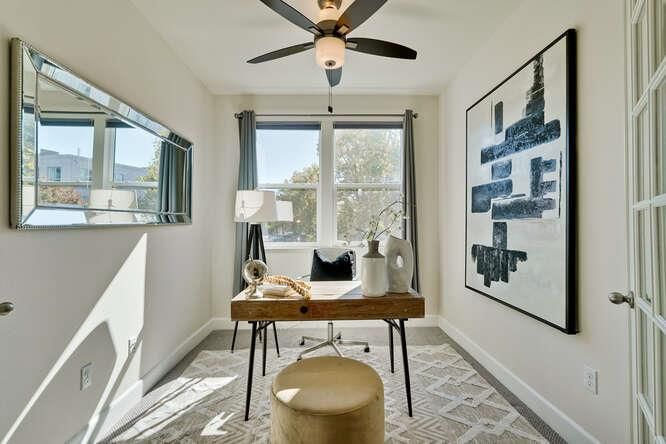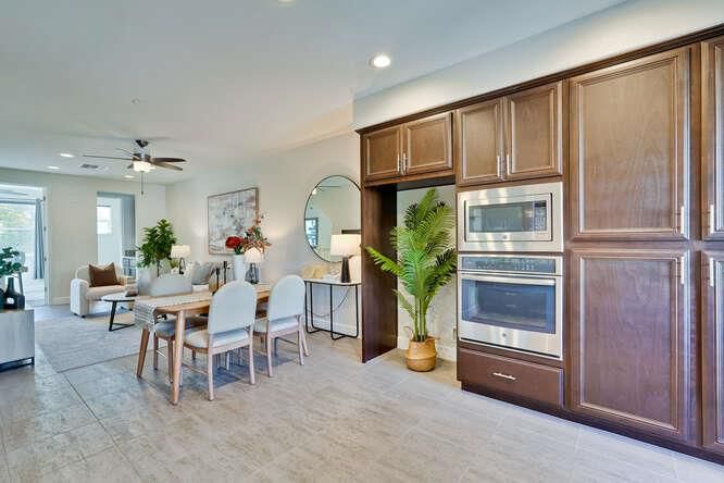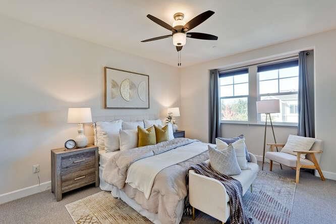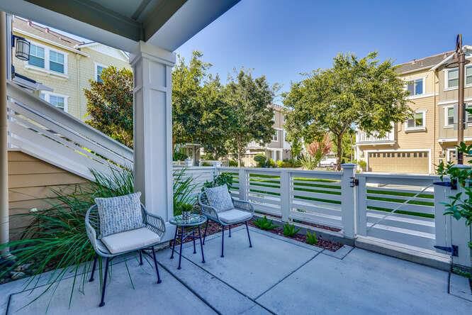 Welcome to the sophisticated luxury of this contemporary townhome. Completed in 2016, this home has two bedrooms, two and a half bathrooms, an office, and an attached two car garage. This fully electric, stylish home features many modern conveniences, including an eco-friendly thermostat, smart switches and dimmers, seller owned solar system, and AC. It has a gated front patio for entertainment. The main living area features high ceilings, and a light-filled, open-concept kitchen/family room that opens to an elegant balcony for relaxation. A modern gourmet kitchen features major upgrades, including quartz countertops, stainless steel appliances, and modern cabinets. An oversized master suite includes a beautiful shower and dual sink vanity. The washer/dryer place next to the bedrooms for convenience. Located near the Permanente Creek Trail, it offers an easy walk or bike ride to the Googleplex, Safeway, Costco, Caltrain, Castro Street, Shoreline, two nearby parks, the Whisman Sports Center (which has a great community vibe), and the Kannon Do Zen Meditation Center next door. It's also in the award-winning Mountain View school district.
