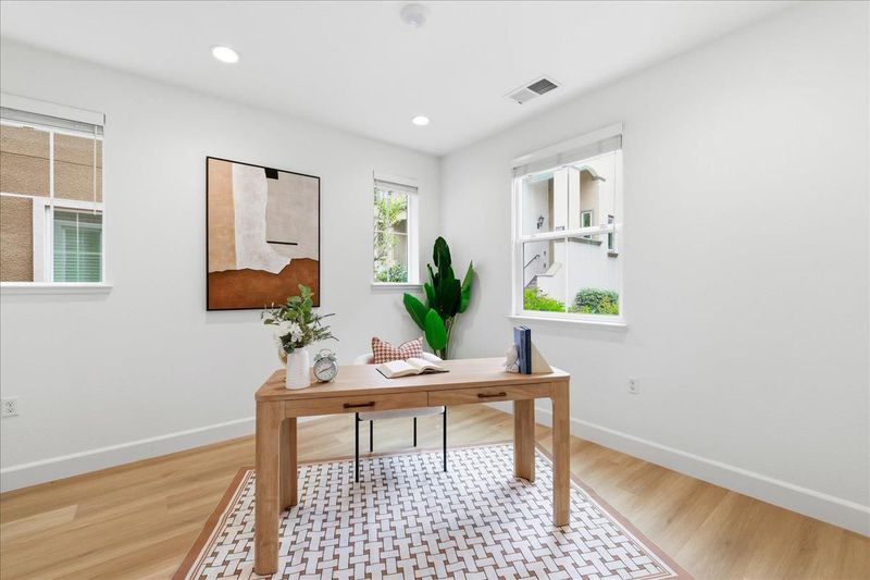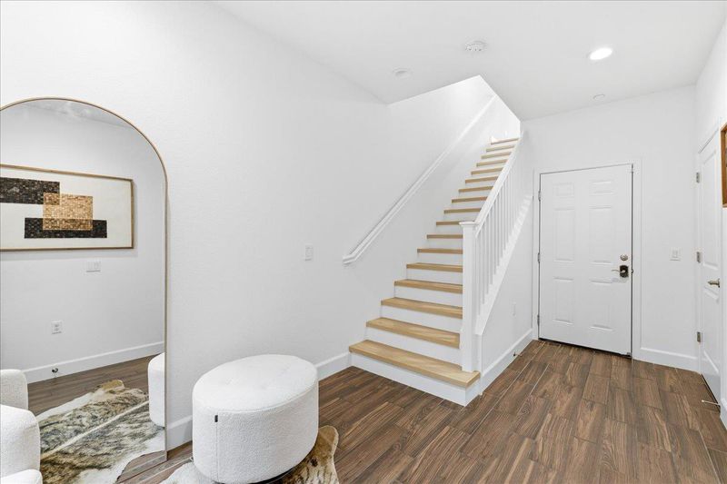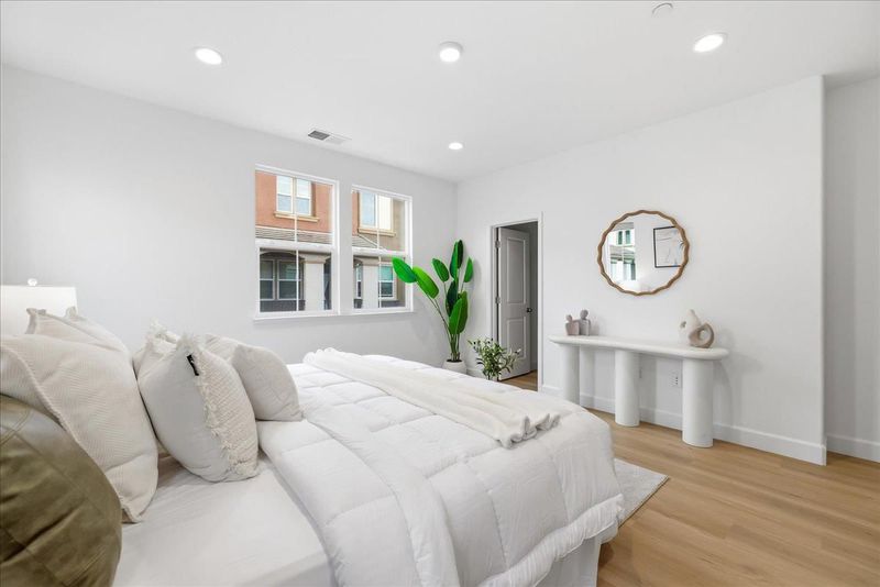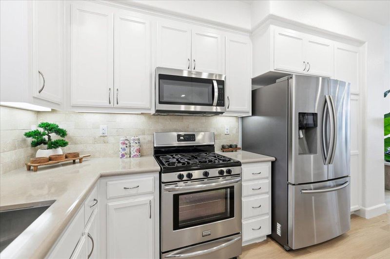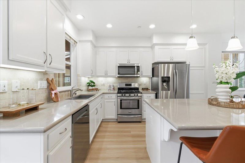 Experience the pinnacle of modern living in this stunning corner-unit townhome located in the heart of the gated Prima community. Thoughtfully designed for privacy and contemporary comfort, this residence boasts an open feel enhanced by abundant natural light and brand new flooring throughout. The chef-inspired kitchen features white shaker cabinets, premium stainless steel appliances, a brand new dishwasher, and a sophisticated textured tile backsplash. Retreat to a primary suite highlighted by tall ceilings, neutral tones, and a luxurious bathroom with a walk-in glass shower and patterned tile flooring. Additional highlights include a private garage, raised panel doors, and a low-maintenance outdoor space perfect for easy living. Ideally situated just minutes from premier retail and dining including Costco and NewPark Mall, this home offers unparalleled convenience with walkable amenities and seamless access to major commuter highways.