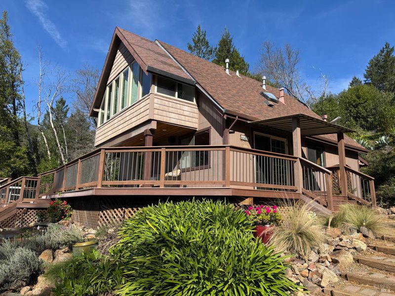 Just minutes to downtown Calistoga this fantastic, private Shangri-la will take your breath away with it's unobstructed, sweeping views. This gated retreat is on approximately 1 level acre on Mt Saint Helena and looks across to Storybook Mountain. Sit in your spa and take in some truly amazing sunsets as you watch the hawks soar across the sky. The approximately 1200 square foot deck provides tons of room for entertaining and the lot has room to garden until your heart is content. The home is tastefully updated with a fantastic open concept kitchen with plenty of cabinets, workspace and a large pantry. Both bathrooms have been updated as well making this home turnkey. Additionally there is greenhouse/potting shed and an aviary. Home is on septic and has an abundant spring fed water source and large capacity storage tank. Satellite wifi with Starlink make working from home a breeze. Ample parking including a two car carport and mutliple spaces available. Room for an RV/boat parking.